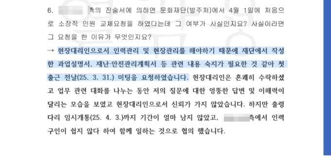 이러한 점들로 B씨는 A 업체와 갈등을 빚었고, 결국 A 업체는 안전관리부소장으로 C씨를 추가로 배치했다. 그러나 C씨 또한 안전에 대한 전문성이 전무한 인물로 알려졌다. 나아가 A 업체는 C씨가 군대 장교 출신으로 직원 통솔 능력을 갖고 있다는 점만으로 그를 뽑은 것으로 전해졌다.