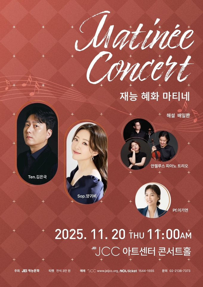 ‘재능 혜화 마티네’ 티켓은 전석 3만 원이며, NOL 티켓 또는 JCC 아트센터 홈페이지를 통해 예매할 수 있다.