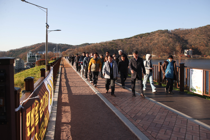 이날 현장에는 주광덕 시장과 시 관계자, 오남읍 시민 30여 명이 함께해 ▲도로 확장 사업 구간 ▲호수공원 진입도로 ▲새로 조성된 맨발길을 함께 걸으며 사업 성과를 확인했다.