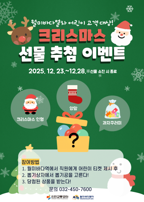 인천교통공사는 18일 월미바다열차 어린이 고객들을 대상으로 선물 추첨 이벤트를 운영한다고 밝혔다. 이번 이벤트는 크리스마스를 맞아 추진됐다.