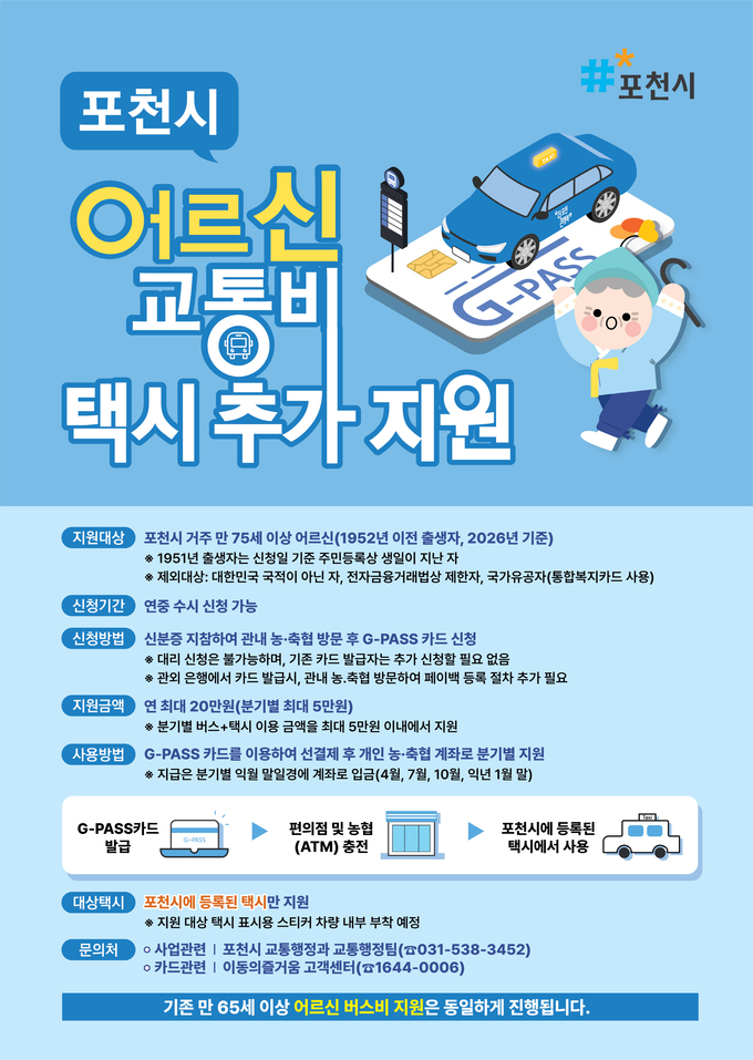 한편 시 관계자는 “어르신들의 이동 편의를 높이고 교통 접근성을 강화하기 위해 지원 대상을 확대했다”며 “어르신들의 이동권 보장을 위한 교통복지 서비스 개선에 지속적으로 노력할 것”이라고 말했다.