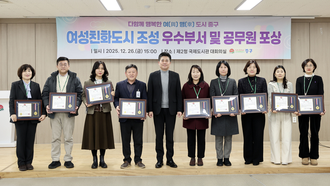 중구는 최근 제2청 대회의실에서 2025년 여성친화도시 사업의 성공적인 추진에 이바지한 6개 부서와 4명의 공무원에게 상장을 수여했다고 30일 밝혔다.