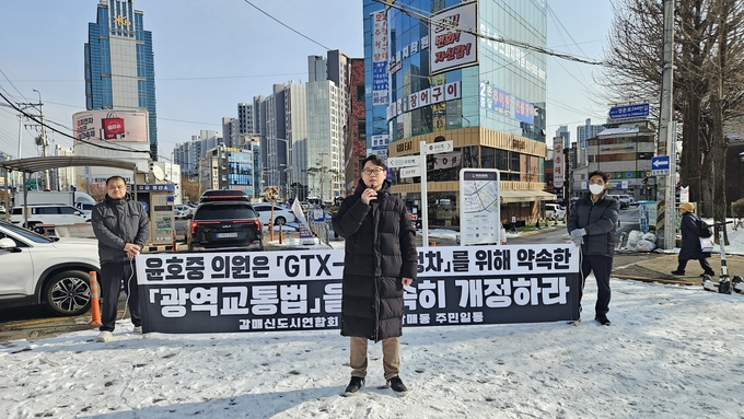 집회 현장에서 갈매동 주민들과 신도시연합회는 “GTX-B 노선의 갈매 정차에 정치생명을 걸겠다”는 윤호중 의원의 공개발언을 스피커로 반복 재생하며, 윤 의원이 GTX-B 갈매역 정차 실현을 위해 직접 발의한 광역교통법 개정안이 현재로서는 가장 현실적인 해법이므로 신속한 개정 처리를 촉구했다.