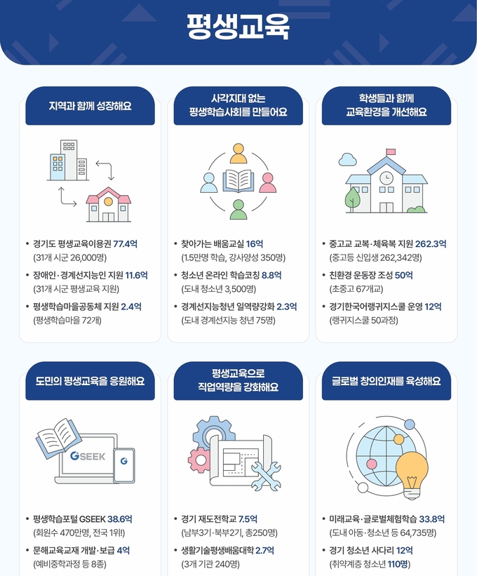 도가 이날 발표한 평생교육 분야 사업계획에는 ‘경기 재도전학교’, ‘학생 교복비 지원’, ‘학습 취약계층에 학습 기회를 지원하는 평생교육이용권’, ‘찾아가는 배움교실’, ‘장애인평생교육시설 교육 확대’ 등 평생교육 사업 추진 내용이 담겼다.