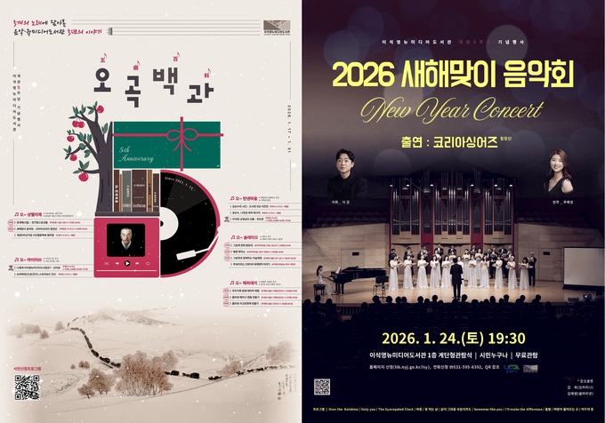 대표 프로그램으로는 오는 24일 오후 7시 30분, 도서관 1층 계단형 관람석에서 열리는 ‘2026 새해맞이 음악회’가 있다. 음악회에는 코리아싱어즈 합창단, 오카리나 연주자 김욱, 클라리네티스트 김예원 등이 출연해 새해의 희망을 전하는 공연을 선보인다.