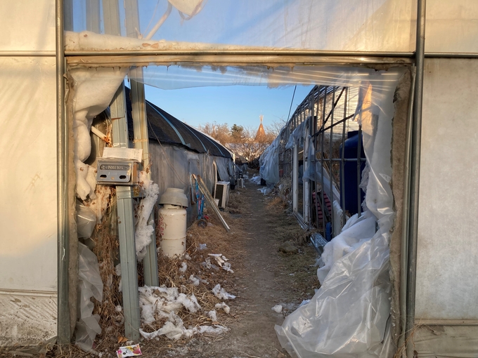 이날 경기남부지역 아침 최저 기온이 영하 14도까지 떨어졌다. 이 곳 비닐하우스촌은 며칠 전 내린 눈이 녹지 않고 얼어버려 곳곳이 빙판길이었다.