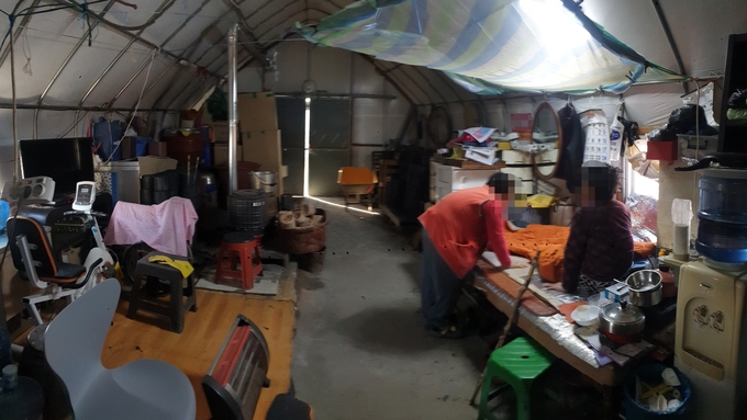 비닐하우스 한 동에는 어떠한 칸막이 없이 연탄, 선풍기, 책상 등 잡동사니가 널브러져 있었다. 매서운 바람과 살을 에는듯한 추위를 막아주는 건 조그마한 연탄 난로와 대문으로 사용하는 철판이 전부였다.