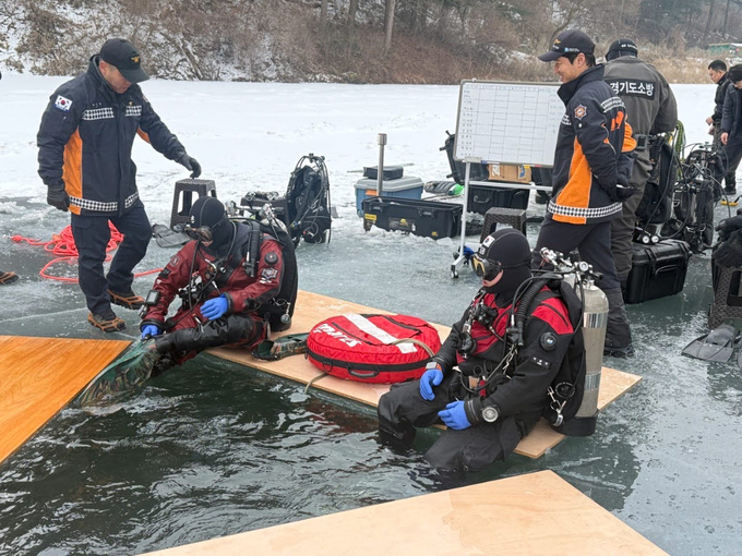 이날 훈련은 ▲동계 수난 및 수중사고 대응 절차 전반 숙달 ▲수상 구조와 얼음 밑 탐색을 통한 구조대상자 탐색·인양 ▲구조대원 비상 상황 발생 시 신속동료구조팀(RIT) 운용 방법 등으로 얼음 붕괴상황을 가정한 구조 훈련을 통해 대원들의 안전 확보와 팀 단위 대응 능력 향상에 중점을 뒀다.