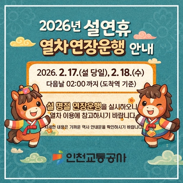 교통공사는 설 명절 당일인 오는 17일과 다음 날인 18일 이틀 동안 심야 임시 열차를 투입할 계획이다. 인천1호선은 2회, 인천2호선은 4회 증편 운영해 종착역 기준 다음 날 새벽 2시까지 연장 운영한다.
