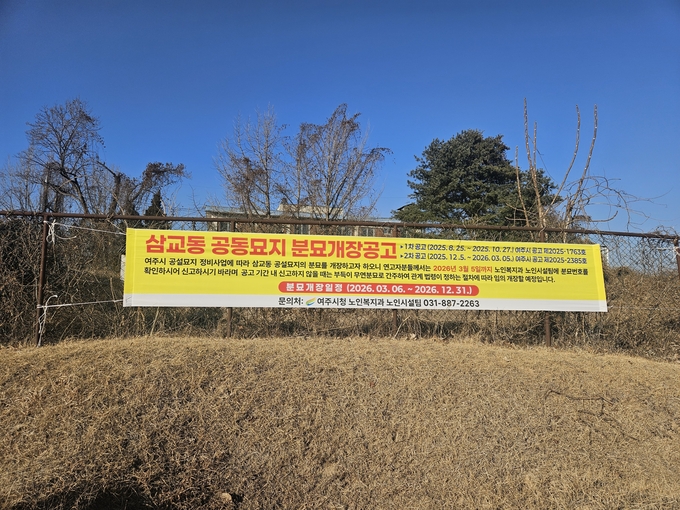 이 사업은 여주시 노인복지과에서 추진하며 오는 4월 6일 삼교동 공설묘지 사용중지 공고를 시작으로 1차 분묘개장 공고(2025. 8. 25 ~ 10. 27)를 거쳐 현재는 2차 공고(2025. 12. 5 ~ 2026. 3. 5)를 진행 중이다. 2차 공고 종료 후인 3월 6일부터는 순차적으로 분묘개장에 착수할 예정이다.