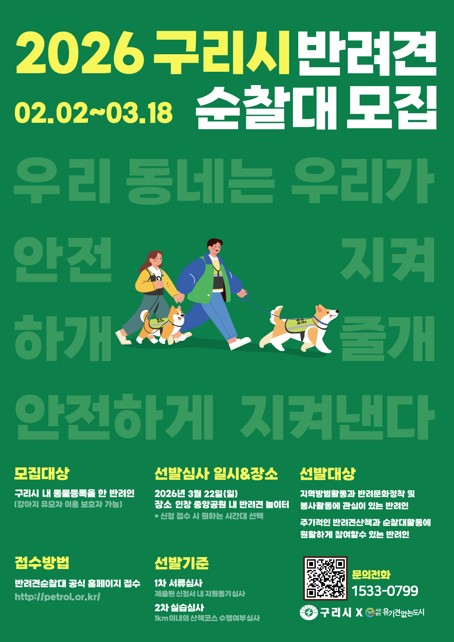 구리시는 반려견과 함께 산책하며 동네의 안전을 살피는 ‘구리시 반려견 순찰대원’을 오는 3월 18일까지 모집한다고 밝혔다.