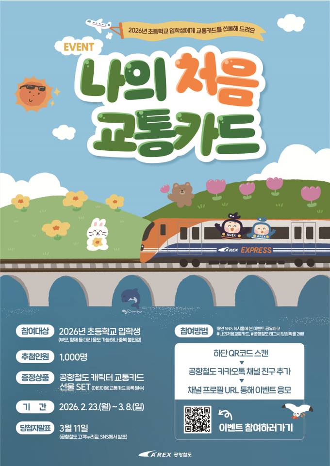 공항철도㈜는 생애 최초로 교통카드를 사용하는 초등학교 입학생들을 대상으로 '나의 처음 교통카드' 이벤트를 펼친다고 23일 밝혔다.