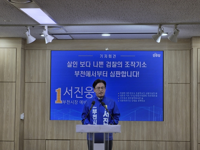 더불어민주당 서진웅 부천시장 예비후보가 5일 오전 부천시청 브리핑룸에서 기자회견을 열고 자신의 후원회장인 김용 전 민주연구원 부원장 등을 겨냥한 정치검찰의 ‘조작 기소’ 의혹을 제기했다.