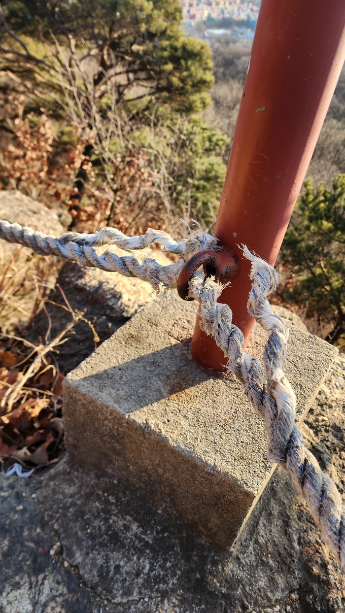 정상으로 오르는 구간의 일부 로프도 여러 가닥의 섬유가 겹쳐 만들어진 구조인데 금속 고리에 의해 겉면이 닳아 내부 섬유가 드러난 부분도 있었다. 또 로프를 고정하는 금속 고리와 연결 장치에도 녹이 발생해 관리가 필요해 보였다.