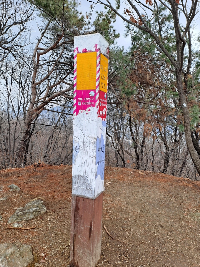 표지판에 산불이나 산악사고 발생기 '119'로 신고하라는 안내 문구는 보였지만, 신고시 소방서에 알려야 할 정확한 위치정보를 표시한 부분은 지워져서 흐릿하게 보였다.
