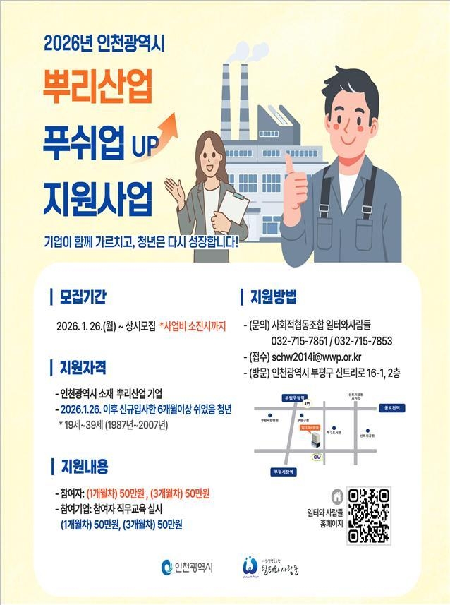 인천시는 뿌리산업의 고용 안정성을 강화하고 청년의 노동시장 진입을 지원하기 위해 ‘멘토멘티 백일업(UP) 지원사업’과 ‘뿌리산업 푸쉬업(UP) 지원사업’을 추진한다고 15일 밝혔다.