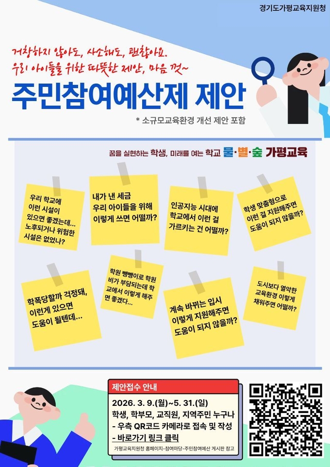 접수된 제안들은 사업 부서의 타당성 검토와 심의를 통해 선정 후 2027년도 경기도교육청 본예산 편성 시 반영될 예정이다. 이외에도 제안을 희망하는 주민 누구나 가평교육지원청 홈페이지의 주민참여예산 팝업QR코드 접속을 통해 참여할수 있다.