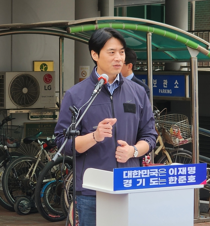 더불어민주당 한준호 경기도지사 경선 후보가 30일 오후 광명시립하안노인종합복지관 앞에서 열린 ‘3차 비전선포 기자회견’에서 돌봄 정책을 발표했다.