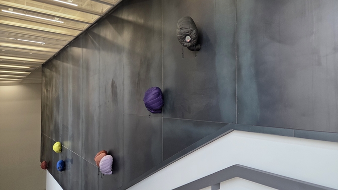 이어 2층 계단으로 오르면 연진영의 '키링의 사원' 중 하나인 패딩으로 만든 감시 카메라가 복도 곳곳에 설치돼 있다.