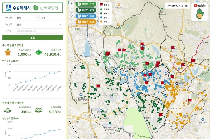 손바닥정원은 2023년 첫 조성을 시작으로 빠르게 확산됐다. 현재까지 조성된 정원은 총 1001개. 면적은 약 4만5920㎡로, 축구장 6개를 훌쩍 넘는다.
