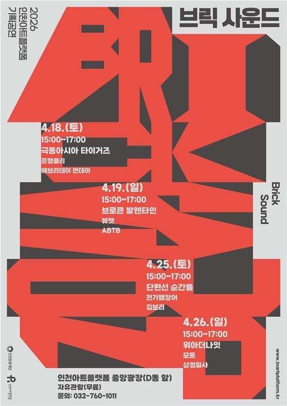 인천문화재단은 야외 음악 공연 ‘브릭 사운드(Brick Sound)’를 오는 18~19일, 25~26 2주간(토, 일) 총 4일간 인천아트플랫폼 중앙광장(D동 앞 버스킹 존)에서 공연을 개최한다.