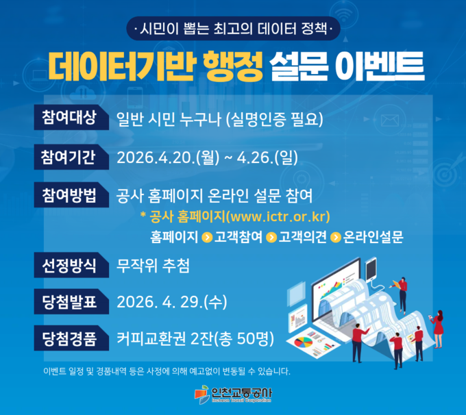 인천교통공사는 오는 20일부터 26일까지 데이터·AI 기반 정책에 대한 시민 의견을 듣기 위한 설문 이벤트를 실시한다.