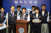 ▲ ‘사퇴 요구’ 10일 오후 경기도청 공무원노조 최석현 위원장 직무대리가 명패를 투척한 박광진 의원에 대한 한나라당 탈당과 의원직 사퇴 등을 요구하는 기자회견을 열고있다./장태영기자 jty1414@ ▲ ‘진땀 해명’ 10일 경기도의회 예산결산위원회(위원장 최환식) 소속 의원들이 도의회 브리핑 룸에서 지난 9일 예결위 심의과정에서 자치행정국 공무원에게 명패를 던진 현황에 대한 기자회견을 열고 있다. /장태영기자 jty1414@ “집행부 간부에 폭력… 절대 용납 못해” “거짓답변 일관… 사과없는 집행부 탓” 양측 관련의원 징계 수위 놓고도 대립 경기도의회 예결위원회에서 9일 발생한 박광진(안양5)의원의 명패 투척과 도 자치행정국 세정과 김 모 공무원의 욕설 파문<본지 10일자 3면>이 일파만파로 확산되고 있는 가운데 책임 문제를 둘러싼 예결위와 도청노조의 대립도 첨예화되고 있다. 양측은 10일 오후 각각 잇따라 기자회견을 열고 ‘장군-멍군 식’ 책임 공방을 벌였다. 예결위측은 “사건이 발생한데에는 거짓 답변