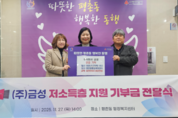 송오용 ㈜금성 대표이사는 지난달 27일 안양시 동안구 평촌동 행정복지센터를 찾아 이웃돕기 성금 1000만 원을 기탁했다. 송 대표는 “맡긴 성금이 한부모 가정과 홀몸 어르신 등 취약계층이 따뜻한 연말을 보내는 데 보탬이 되길 바란다”며 “앞으로도 어려운 이웃들을 돌아보며, 지역사회에 공헌하는 기업이 되도록 노력하겠다”고 말했다. 강윤덕 평촌동장은 “성금을 기탁한 ㈜금성에 감사드린다”며 “모든 임직원들의 소중한 마음을 담아 어려운 이웃들이 따뜻하고 행복한 연말연시를 지내실 수 있도록 잘 전달하겠다”고 답했다. ㈜금성은 임직원수 40여 명 평촌동 관내 중소기업으로, 금속구조물, 창호공사 등의 사업을 하고 있다. [ 경기신문 = 송경식 기자 ]