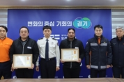 포천소방서는 시 관내에서 발생한 화재를 초기에 신속한 진화에 나서 피해를 최소화할 수 있도록 기여한 민간인 2명을 소방서로 초청한 가운데 이들에게 화재진압 유공 표창장을 수여했다고 29일 밝혔다. 지난 28일 표창을 수상한 윤필용(84년생)씨와 네팔인 근로자 사우다 마단(99년생)씨는 지난해 12월 18일 12시50분 경, 근무지 인근 산업시설에서 발생한 화재를 목격하고, 초기 화재 진압과 인근 야산으로 번지는 불을 막아 피해를 최소화 하는데 기여한 공로로 표창을 수여 받았다. 이들은 이날 옥내소화전에서 호스를 240m 이상 연장하여 신속하고 침착하게 대응해 조기에 화재 확산을 막을수 있도록 하여 추가 피해를 예방하는 데 큰 역할을 했다. 한편 포천소방서 임찬모 서장은 “위험한 상황 속에서도 망설임 없이 나서 준 시민들의 용기 있는 행동이 더 큰 재난을 막을수 있었다”며 “이웃의 안전을 지킨 모범적인 사례로서, 지역사회 전반에 안전의식을 확산하는 계기가 될 수 있을 것으로 기대한다”고 말했다. [ 경기신문 = 김성운 기자 ]